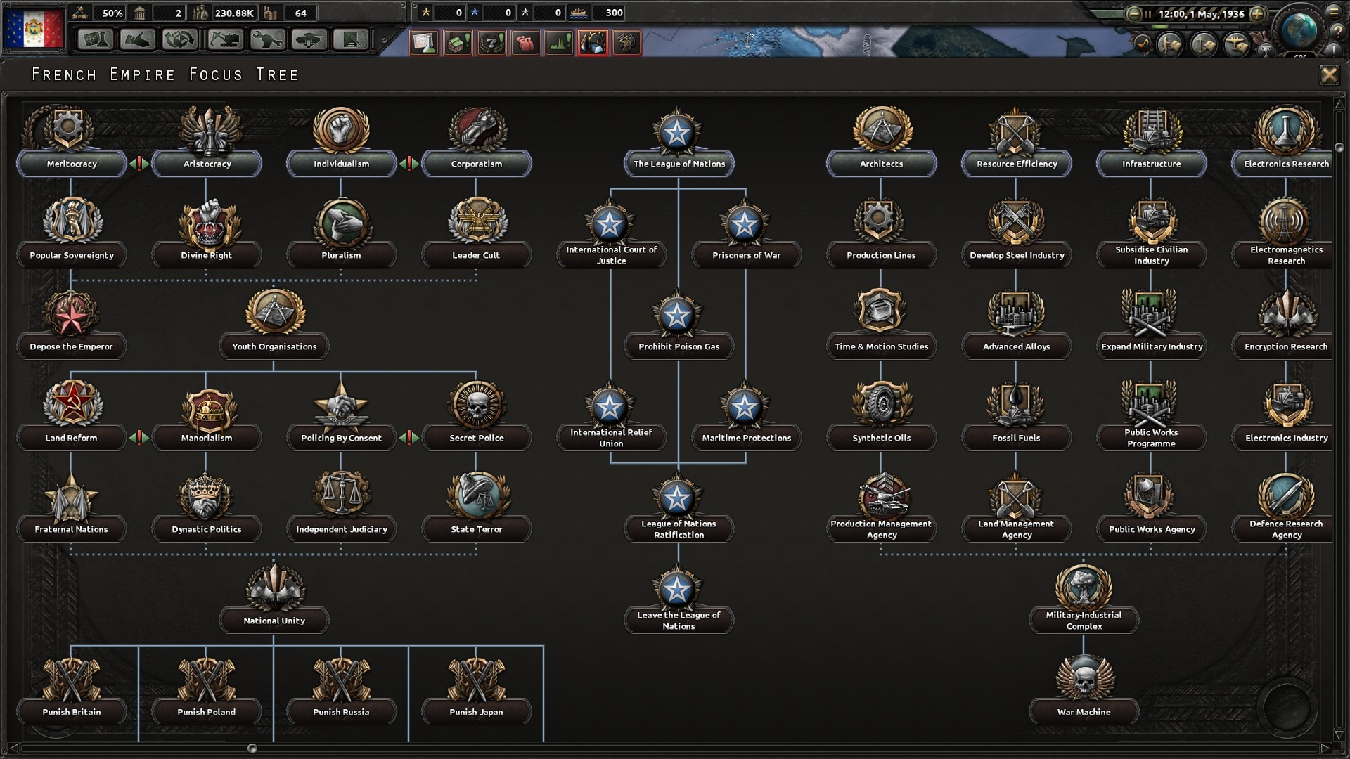 Encore une uchronie, et pas n’importe laquelle, celle de l’empereur Napoléon III. Ce mod particulièrement apprécié refond les provinces, les régions, les arbres de priorités et bon nombre de technologies et de nations, pour nous plonger dans un 1936 alternatif, où le Second Empire de Louis-Napoléon Bonaparte ne s’est jamais effondré. Ce dernier a poursuivi le système continental voulu par son prestigieux tonton, et évité les énormes bourdes qui l’ont historiquement conduit à finir sa vie à l’ombre d’un marronnier britannique.