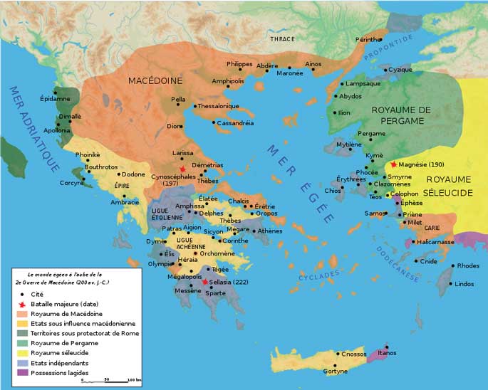 Ainsi, nous pouvons voir sur la carte ci-dessous, où se situe précisément les protagonistes : Sparte au sud de la Grèce, la ligue achéenne au centre et la Macédoine au nord. Même si ce plan reprend les territoires vers -200, ceux-ci ont peu changé avant la conquête romaine.