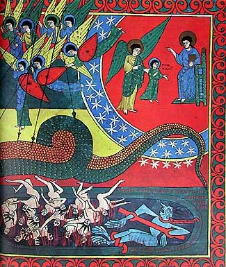 « Puis je vis un Ange descendre du ciel ayant en main la clé de l'Abîme ainsi qu'une énorme chaîne. Il maîtrisa le Dragon et l'antique Serpent [Satan] et l'enchaîna pour mille années. Il le jeta dans l'Abîme tira sur lui les verrous, apposa les scellés afin qu'il cessât de fourvoyer les nations jusqu'à l'achèvement de mille années. Après quoi il doit être relâché pour un peu de temps. »