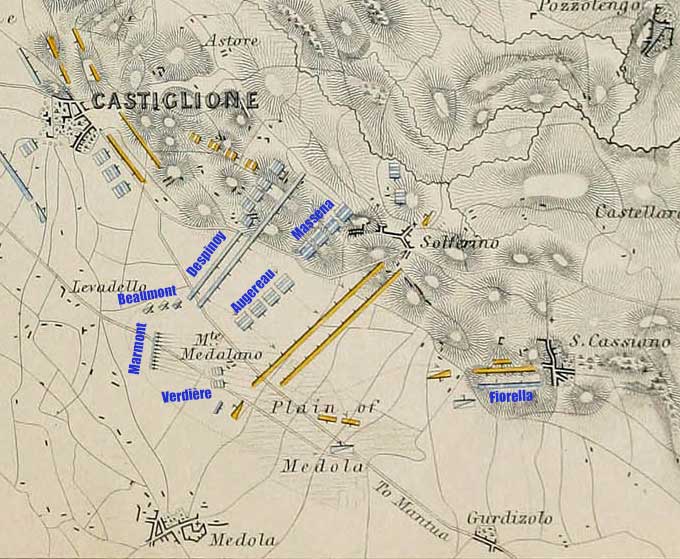 Le 5 août au matin, les troupes françaises se tenaient prêtes sur les hauteurs de Castiglione. Les troupes autrichiennes, quant à elles, avaient formé une ligne entre Solferino et le Monte Medolano. Dans cette plaine, la colline était le point d'appui du flanc gauche autrichien et la clé de voûte de la bataille.