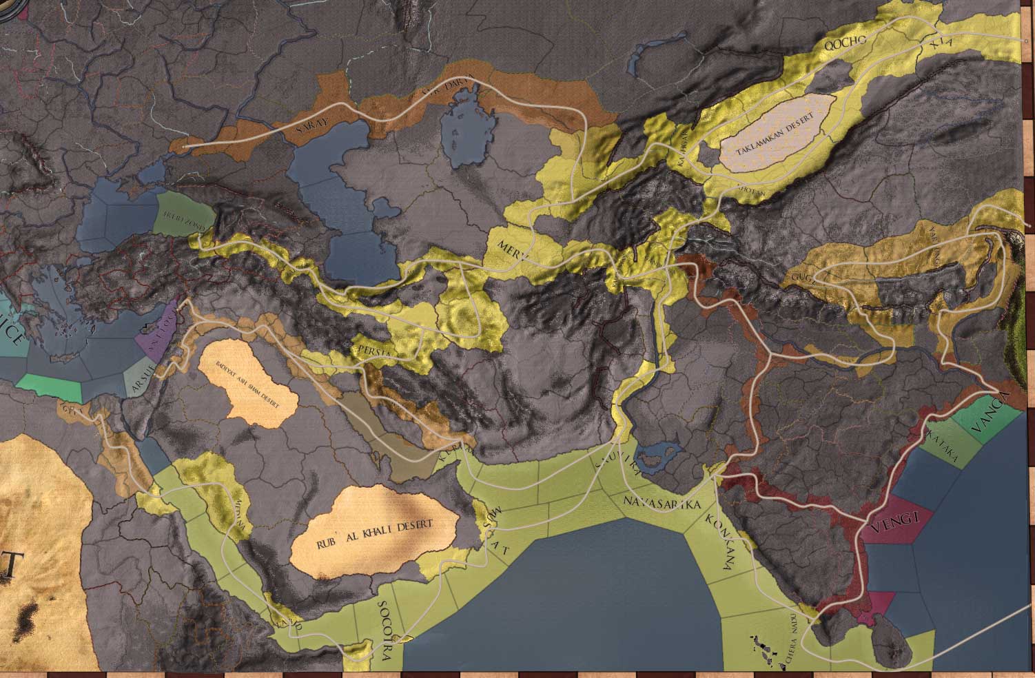 Il faut dire que l’importance de la région, capitale, est souvent minorée. La seule route de la soie, implémentée comme une voie commerciale principale dans le jeu de façon plutôt pertinente, suffit à nous faire comprendre l’intérêt stratégique de cette zone.