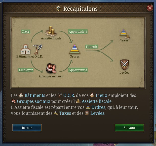 Il ne s'agira pas tant de représenter un inamovible tiercé d'ordres divisés entre noblesse, clergé et tiers état (un peu trop spécifique au féodalisme européen). Ici, votre peuple est divisé en pouvoir : le vôtre, celui de la Couronne, puis celui de la Noblesse, très préoccupée de conserver ses privilèges, qui fournira les troupes d'élite et l'essentiel de l'influence culturelle ; puis le Clergé, évidemment ultraconservateur (ça va vous poser problème) mais dont le contentement permettra de stabiliser le pays et de l'alphabétiser, puis la Bourgeoisie, qui ne pense qu'aux affaires et qui rendra le pays plus productif, et enfin les Paysans, représentant 90% du pays et éternels pourvoyeurs de fonds, qui n'auront que peu voire aucune présence au gouvernement, mais qui rappelleront de temps à autres à quel point ils en ont gros. Mentionnons aussi les Tribus, relativement rares (vous n'en aurez pratiquement jamais en Europe, mais ailleurs un peu plus) qui fourniront des matières premières et des guerriers.