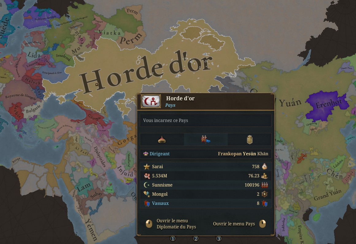 1. Qui peut espérer s'opposer à la puissance terrifiante de la Horde ? - 2. Les peuples américains ont tout un continent pour eux, mais un compte à rebours sur la tête.Avec 500 ans devant soi, ça laisse le temps de faire des choix. Europa Universalis IV était sorti en 2013, et s'était depuis empiffré d'une quantité effrayante de DLC parfois loués, parfois haïs, qui en avait fait un monstrueux mille-feuilles d'une complexité rebutant trop souvent le nouveau joueur. Quelques game designers barcelonais intelligents, du studio Paradox Tinto, sont passés par là et ont décidé de travailler en pensant accessibilité avant tout. Grâce à cet excellent système d'infobulles, l'information recherchée n'est jamais très loin.