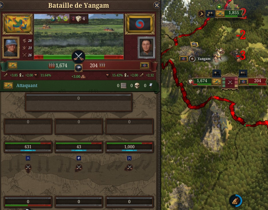 11. Même submergé par le nombre, parfois certaines batailles peuvent être remportées grâce à la qualité.Quant à l'aspect militaire, il rappelle certains éléments de Hearts of Iron ou de Crusader Kings : on y retrouve la nécessité de penser le placement de ses troupes dans la ligne de bataille, d'y apporter des bonus de commandement, de moral et de nourriture, de penser à l'attrition et donc au ravitaillement, et bien sûr au type de troupes.