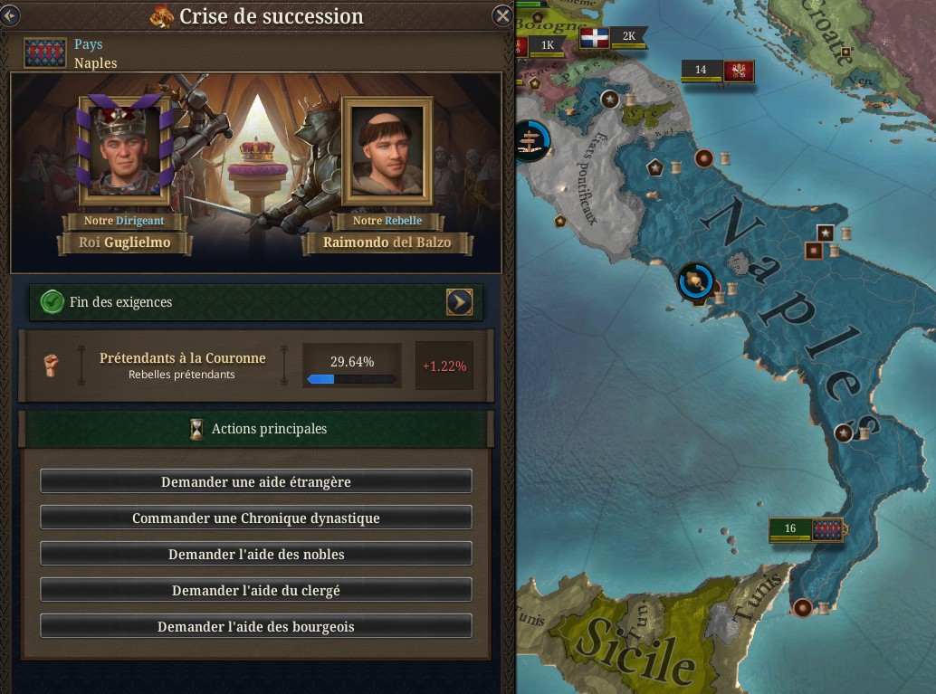 6. Si vous pouvez, investissez en masse dans les hôpitaux : c'est tout ce que vous pouvez faire pour freiner ce fléau. - 7. Attention aux révoltes !Le gameplay militaire est lui aussi concerné par l'économie, qui lui assure les revenus et la nourriture pour payer et nourrir les troupes, et par le politique qui lui fournit les bons commandants et voit grandir la lassitude de guerre ; tandis que le gameplay politique est à son tour dépendant des évènements économiques et militaires pour avoir des terres et des titres, voire s'engager sur la scène internationale en prenant part aux complots et aux conflits de succession.