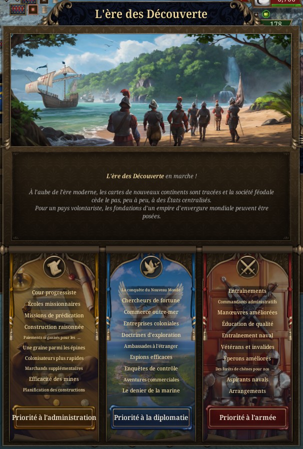 8. Certaines technologies sont verrouillées par l'âge où vous vous trouvez, mais vous avez le choix de leur priorité. - 9. À chaque changement d'ère, c'est à vous de définir votre orientation.Un mot sur cette dernière : fort bien fournie, elle vous permet de faire à peu près n'importe quoi en matière de coalitions et d'alliance, de fournir un soutien militaire ou économique discret à un voisin que vous aimeriez ne pas voir tomber trop tôt, de demander des droits de mouillage et d'accès au marché, de faire ou proposer des emprunts monétaires (ou des dons), d'envoyer des invitations à différentes organisations internationales comme des ligues européennes ou des sectes orientales, des demandes en mariage, ou tout simplement d'envoyer une lettre au roi voisin pour lui conseiller de manger ses grands morts (et même de faire croire à ses ennemis que lui l'a fait, pour ruiner sa réputation). Nourrie d'une valeur de « capacité diplomatique » qui dépend de vos investissements en la matière, elle vous permet de faire à peu près ce que vous voulez sur la scène internationale.