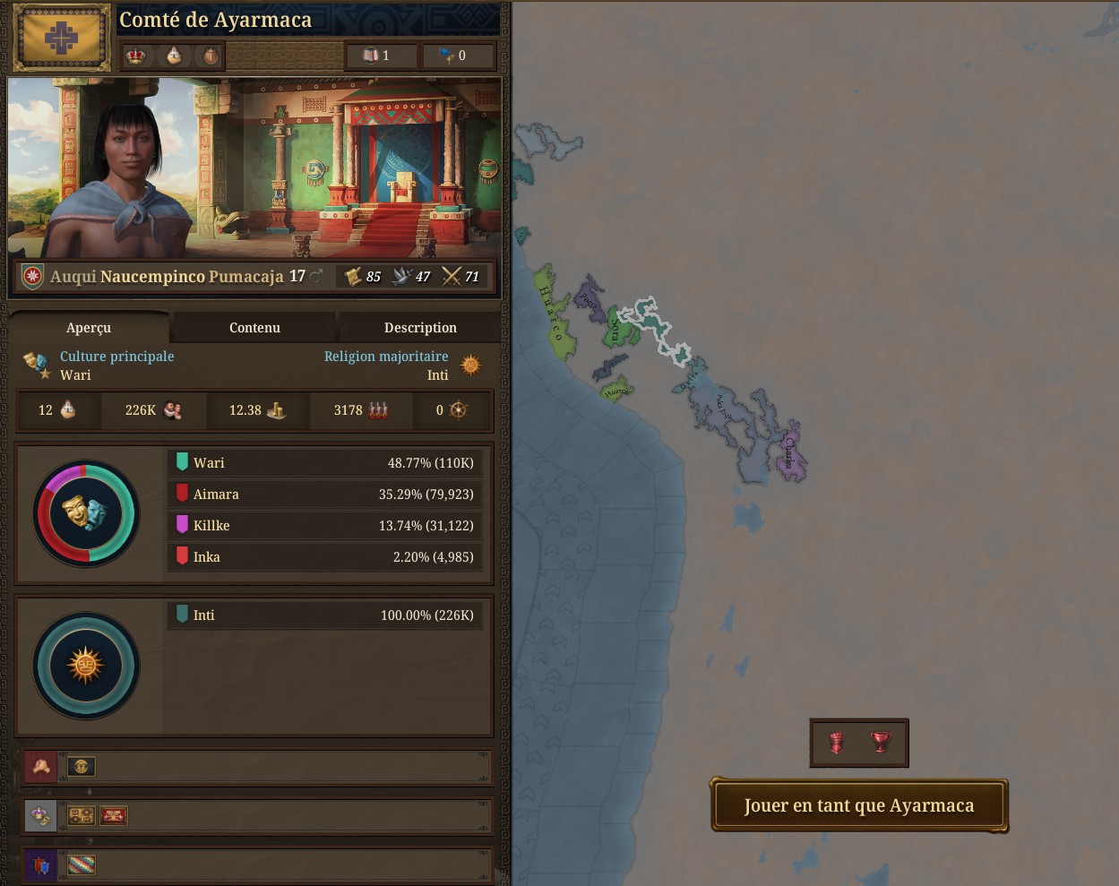 Franchement, ça l'est. On se retrouvera encore beaucoup à chercher la raison d'une inexplicable baisse de revenus ou de soutien, ou d'une défaite militaire ; et la traduction approximative du titre n'aide pas, parfois, à comprendre ce qu'on a sous les yeux. On remarquera aussi assez vite que certaines parties du monde ont été un peu mises de côté, comme les multiples principautés centre-américaines du monde aztèque qui ne peuvent pas s'unir sans provoquer une boucle de gameplay bloqué où les familles royales sont égorgées tous les deux mois ; cela fera l'objet d'un DLC, je parierait trente florins dessus.