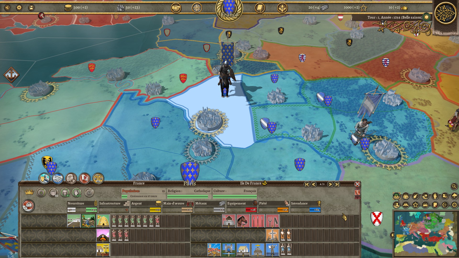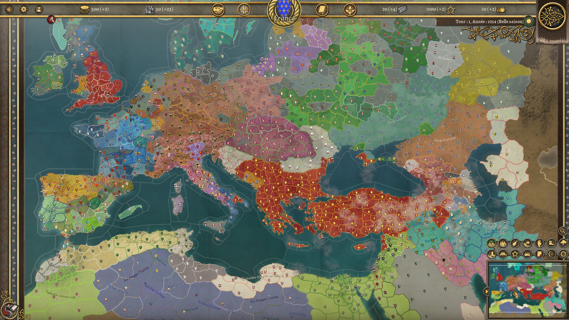 Vous voilà donc devant une grande carte s'étendant de l'Espagne et l'Irlande aux montagnes de Perse. Du sud de la Norvège à la Maurétanie. 164 factions jouables, avec leurs traits, leurs situations de départ, leurs vassaux et suzerains. La Grande Campagne propose d'aller de 1054 à 1274 au rythme de 2 tours pas an. En plus de cette campagne, trois autres vous donnent la possibilité de jouer dans de plus petits cadres historiques.