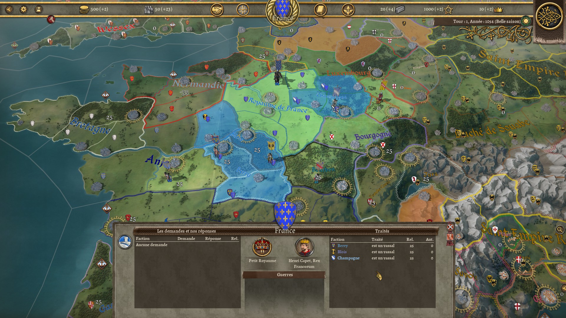 Parce que nous sommes au Moyen-âge, vous serez poussés à décentraliser votre État. Cela passe par l'utilisation de vassaux. Selon votre statut de faction, vous aurez un Domaine Royal de plus ou moins grande taille. Si vos terres dépassent cette valeur, votre Autorité aura des malus. Pour compenser cela, vous pouvez donner une province à un vassal. Non seulement, cela permet de réduire votre nombre de territoires, mais en plus augmentera légèrement la taille maximale de votre Domaine Royal. Ainsi, plus vous aurez de vassaux et un statut de faction élevé, plus vous pouvez agrandir votre domaine sans voir votre Autorité affaiblie. De plus, vos vassaux vous payent une taxe et "peuvent" vous aider à la guerre.